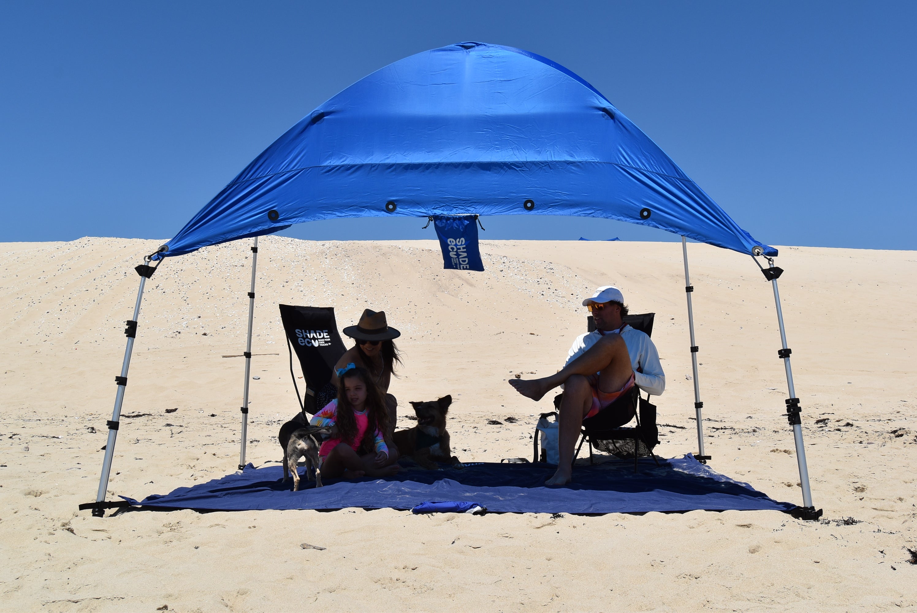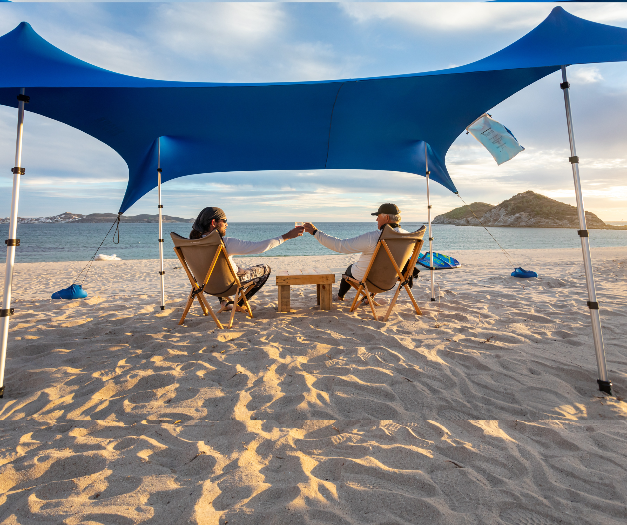 Shadeeco Nomad UV-Protective Beach Sun Shade, a versatile, portable sun shelter with easy setup, lightweight telescopic posts, and durable sand bags for stability. Available in 2 Post, 4 Post, and XL family pack, it offers UPF rated UV protection, breathable fabric for airflow, and spacious coverage for 2–8 people on any beach day.